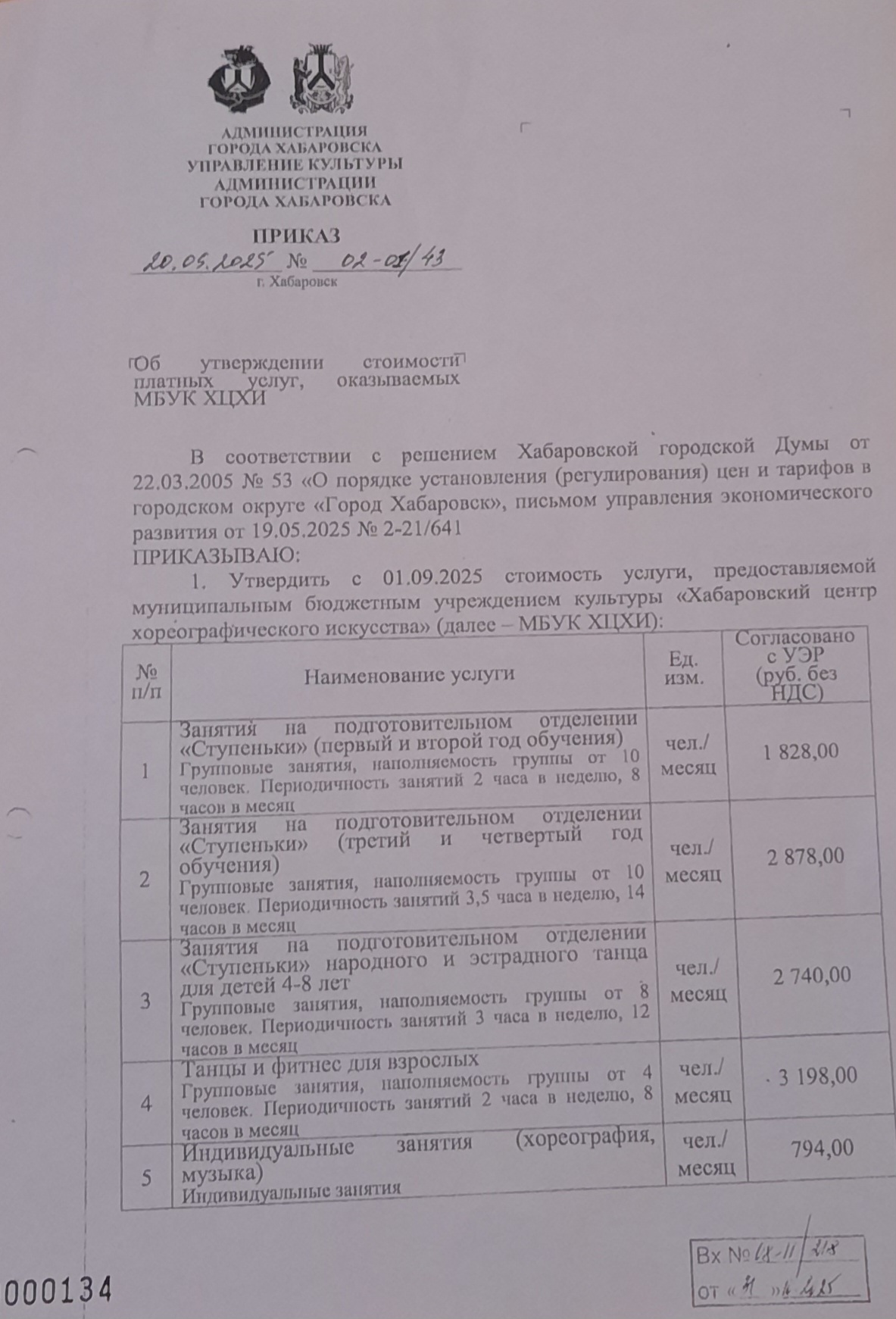 1. Утвердить с 01.09.2025 стоимость услуги, предоставляемой муниципальным бюджетным учреждением культуры «Хабаровский центр хореографического искусства» (далее — МБУК ХЦХИ).