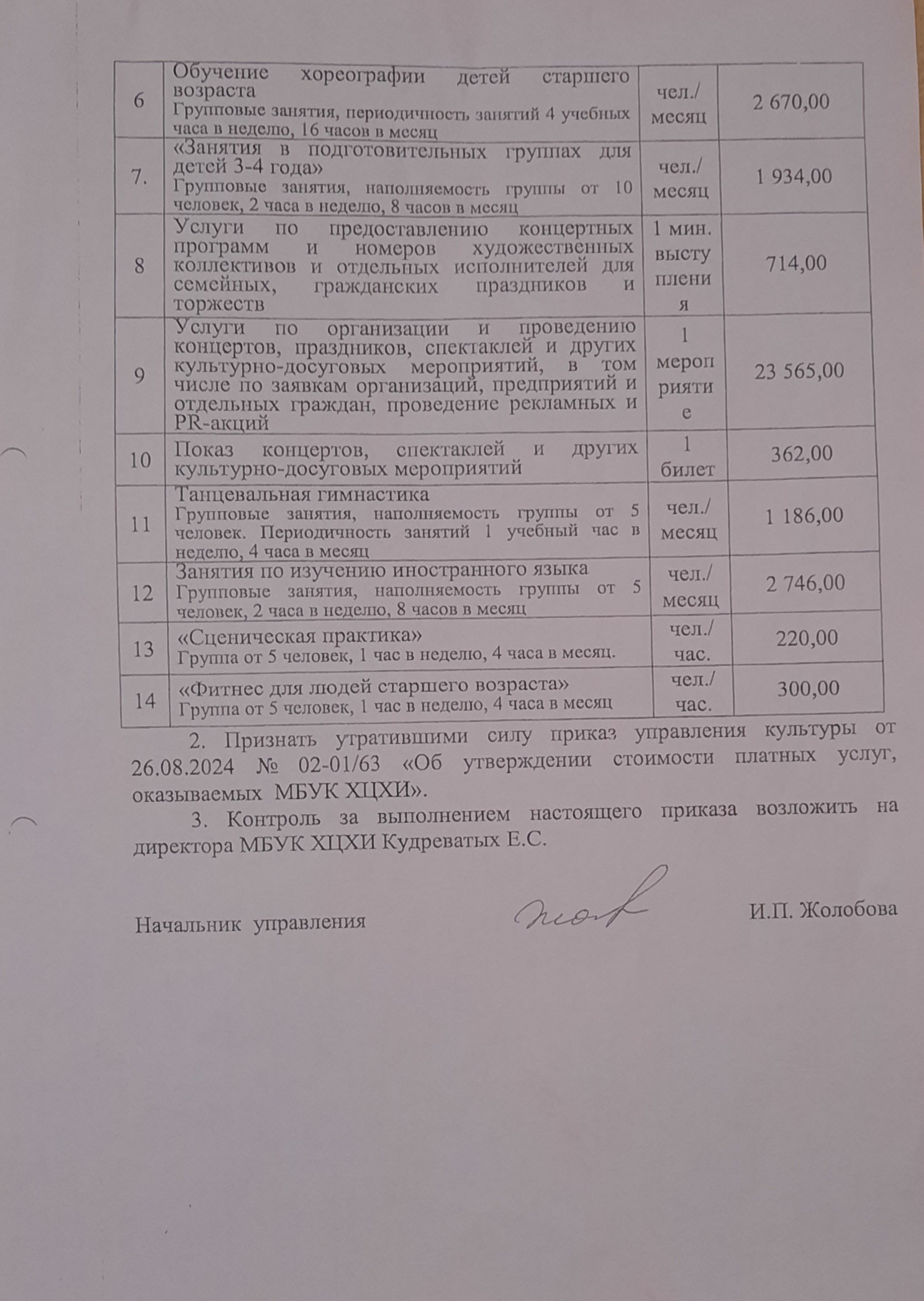 2. Признать утратившим силу приказ управления культуры от 26.08.2024 № 02-01/63 «Об утверждении стоимости платных услуг, оказываемых МБУК ХЦХИ».